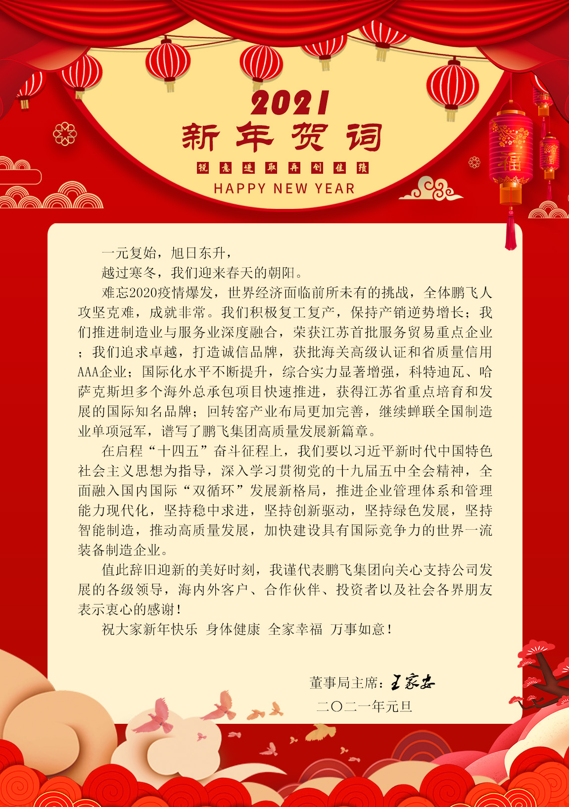 值此辭舊迎新的美好時刻,我謹代表鵬飛集團向關(guān)心支持公司發(fā)展的各級領(lǐng)導(dǎo),海內(nèi)外客戶、合作伙伴、投資者以及社會各界朋友表示衷心的感謝!