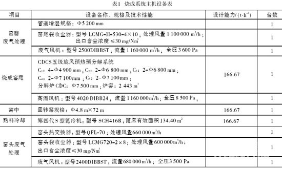根據(jù)該項目的建設規(guī)模和地處高海拔地區(qū)這一特殊情況,熟料燒成系統(tǒng)設計采用了一套改進型雙列五級CDC二代預熱預分解系統(tǒng)、Φ4.8 m×72 m回轉窯和第四代S型篦式冷卻機等設備組成的窯外分解煅燒系統(tǒng),日產(chǎn)熟料4 000 t,熟料燒成熱耗3 554.36 kJ/kg(850 kcal/kg)。本配置在平原地區(qū)其熟料生產(chǎn)能力可達到5 500 t/d左右。系統(tǒng)主要設備配置見表1。