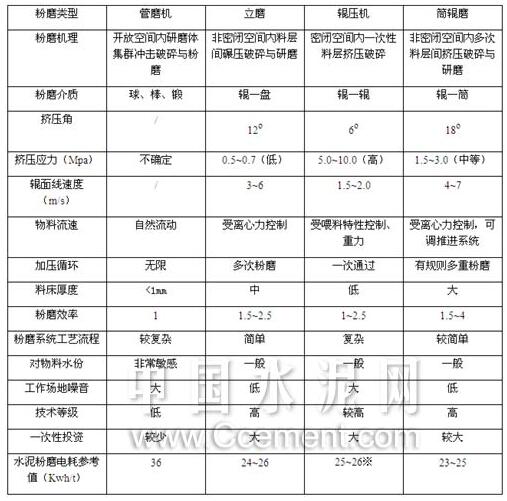 表1 管磨機(jī)與立磨、輥壓機(jī)、筒輥磨粉磨特性對(duì)比