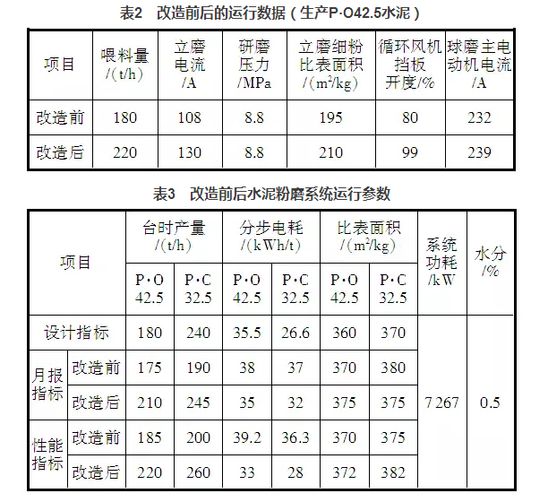 通過以上幾個方面的整改,水泥粉磨系統(tǒng)的臺時產(chǎn)量有了明顯提升,表2是改造前后的運行數(shù)據(jù),表3是水泥粉磨系統(tǒng)改造前后操作參數(shù)對照。