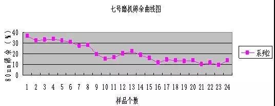 鑒于六七號磨機(jī)的狀況,我們對兩臺磨機(jī)停磨進(jìn)磨觀察,六號磨機(jī)內(nèi)兩倉料球比過高,進(jìn)磨后看不到鋼球,物料高出一個(gè)鋼球的高度,正常情況下鋼球應(yīng)該高出料面露出半個(gè)鋼球?yàn)樽罴?,隨現(xiàn)場測量計(jì)算六號磨一倉填充率為28.7%二倉為29.0%;七號磨機(jī)進(jìn)磨觀察一倉鋼球露出料面一半,說明填充率應(yīng)該是可以的,測量計(jì)算一倉的填充率為31.2%二倉為29.2%;這種磨機(jī)的最佳填充率一倉為30%左右二倉為31%左右。隨取七號磨樣做了磨機(jī)的篩余曲線,磨機(jī)均采用急停的停磨方式,入磨共取樣品24個(gè)做80um和200um的篩余。見圖1。
