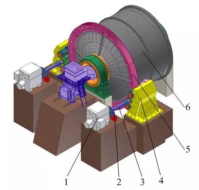 1. 同步電動機 2. 制動器 3. 力矩限制聯(lián)軸器 4. 多點嚙合減速器 5. 齒圈 6. 磨機本體