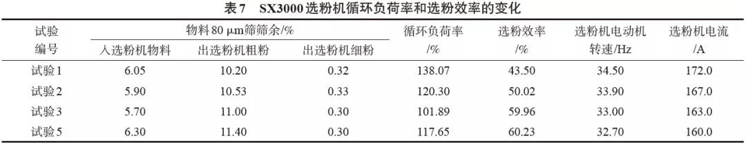 SX3000型選粉機(jī)系統(tǒng)循環(huán)負(fù)荷率和選粉效率對比見表7。