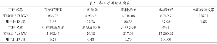 水泥企業(yè)電力消耗主要是設(shè)備動(dòng)力拖動(dòng),一部分由社會(huì)電網(wǎng)提供,另外一部分由企業(yè)余熱發(fā)電廠提供。2018年企業(yè)外購電力13 688.15 萬kWh,余熱自發(fā)電4 112.77 萬kWh,合計(jì)17 800.92 萬kWh全部用于水泥生產(chǎn)。各工序用電流向如表2所示。