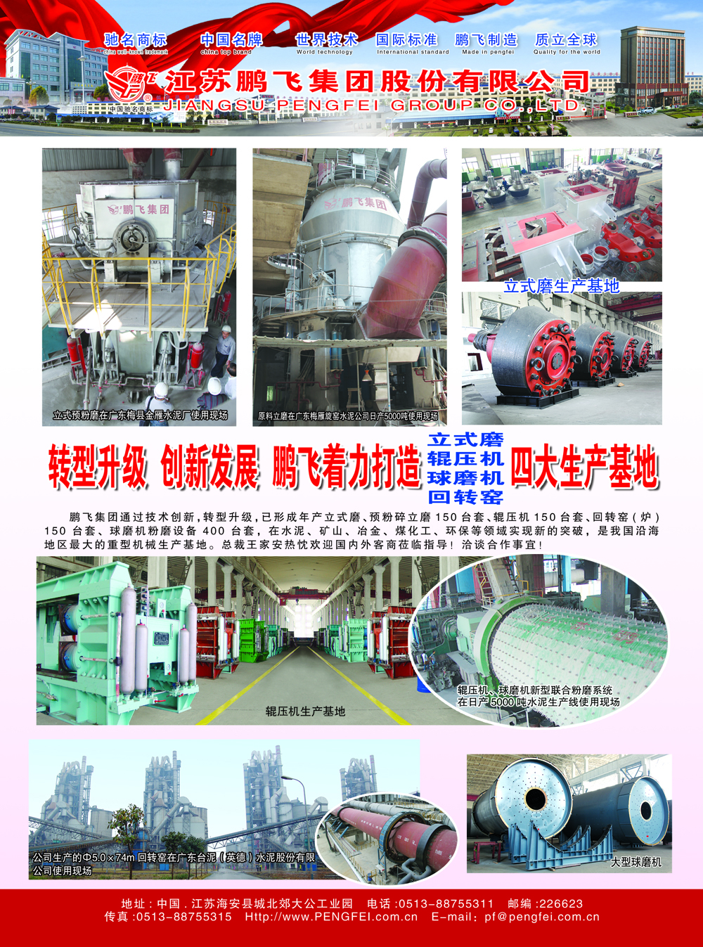 鵬飛集團(tuán)通過技術(shù)創(chuàng)新,轉(zhuǎn)型升級,已形成年產(chǎn)立式磨、預(yù)粉碎立磨150臺套、輥壓機(jī)150臺套、回轉(zhuǎn)窯(爐)150臺套、球磨機(jī)粉磨設(shè)備400臺套,在水泥、礦山、冶金、煤化工、環(huán)保等領(lǐng)域?qū)崿F(xiàn)新的突破,是我國沿海地區(qū)大型重型機(jī)械生產(chǎn)基地??偛猛跫野矡岢罋g迎國內(nèi)外客商蒞臨指導(dǎo)!洽談合作事宜!