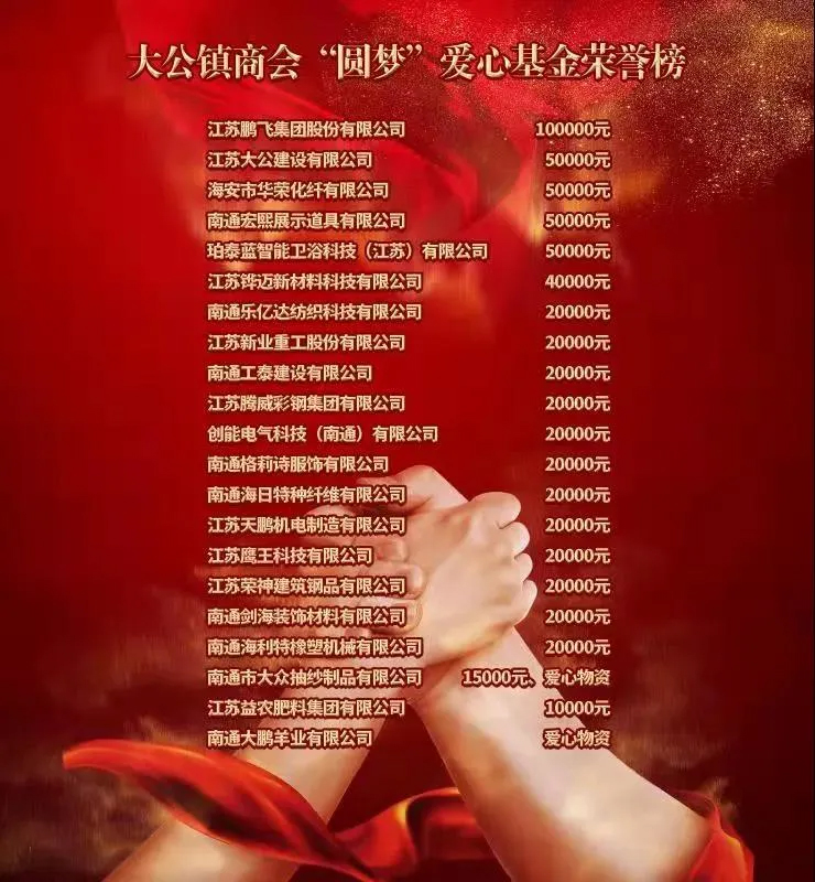 海安市政協(xié)副主席、市工商聯(lián)主席蔡祝平,大公商會會長、鵬飛集團(tuán)董事長王家安共同為愛心基金揭牌,宣布大公鎮(zhèn)商會“圓夢”愛心基金正式成立!前期,大公鎮(zhèn)商會21家副會長單位共計(jì)籌集60.5萬元愛心善款,所募集資金主要用于:幫助困境青少年、開展青少年公益實(shí)踐等活動。