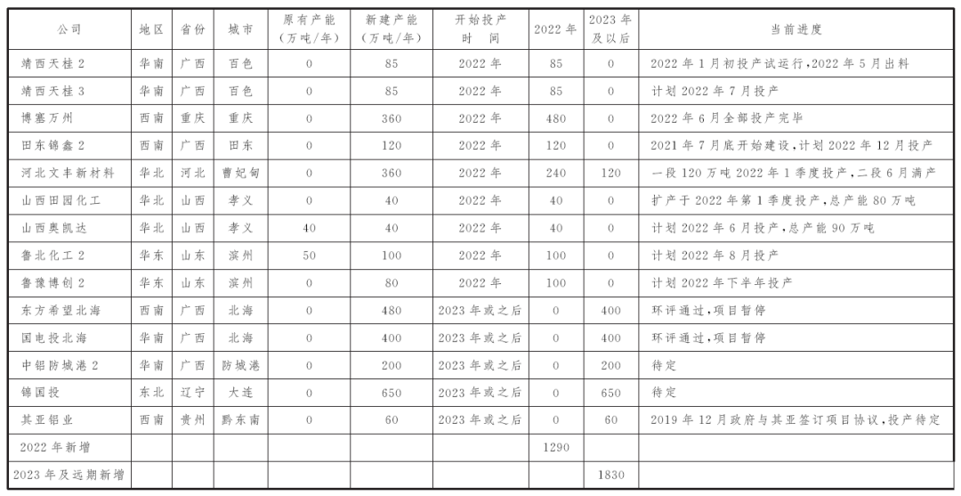 預(yù)計2022年新投氧化鋁產(chǎn)能將達到1290萬噸,在下半年產(chǎn)能繼續(xù)保持快速增加的形勢下,氧化鋁后續(xù)價格或存在下行壓力。