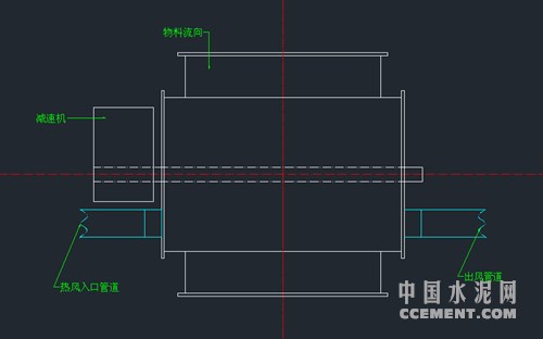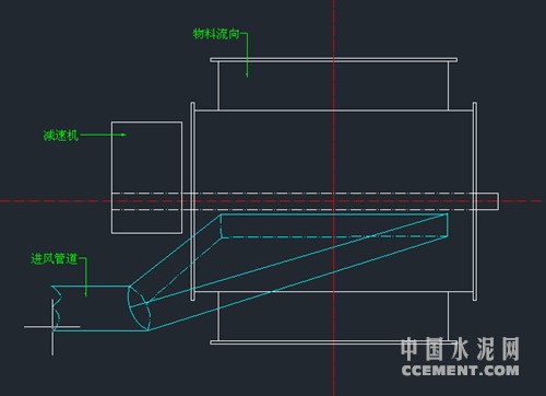 方案三:在鎖風(fēng)閥徑向位置安裝導(dǎo)風(fēng)管,無需再引出管路通到磨機。通方案二將窯尾熱風(fēng)通入鎖風(fēng)閥徑向?qū)эL(fēng)管中,由此來解決粘料問題。后經(jīng)過驗證,這種方法起到了很好的效果,不論是成本,還是空間結(jié)構(gòu),以及施工等方面都是最節(jié)儉的。(如圖二)