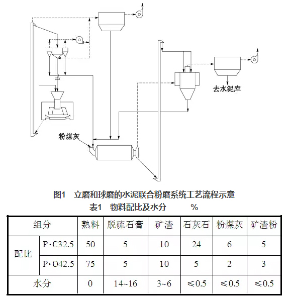 淶水冀東水泥有限公司3個水泥粉磨系統(tǒng)均采用JLMS-24.3立磨與Φ4.8m×9.5m球磨機組成聯(lián)合粉磨系統(tǒng)。JLMS-24.3立磨裝機功率2240kW,磨盤中徑2400mm,3個磨輥,磨盤轉(zhuǎn)速33.58r/min,產(chǎn)量210t/h,入料粒度≤30mm;配套選粉機JXF4100GY,成品量180~220t/h,比表面積≥200m2/kg,最大喂料量600t/h,通過氣體溫度≤150℃,通風(fēng)量(70~90℃)180000m3/h;球磨機Φ4.8m×9.5m,裝機功率3550kW,產(chǎn)量180t/h,生產(chǎn)P·O42.5水泥時,比表面積360~380 m2/kg;配套O-Sepa選粉機,通風(fēng)量240000m3/h,最大通過量720t/h。水泥粉磨系統(tǒng)工藝流程見圖1,系統(tǒng)設(shè)計指標(biāo):生產(chǎn)P·O42.5水泥,臺時產(chǎn)量180t/h,分步電耗35.5kWh/t,比表面積360m2/kg,生產(chǎn)P·C32.5水泥,臺時產(chǎn)量240t/h,分步電耗26.6kWh/t,比表面積370m2/kg。物料配比及相應(yīng)的水分情況見表1。