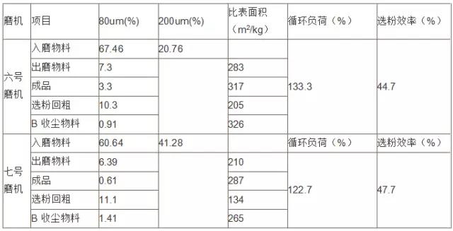 2、同時(shí)對六七號磨機(jī)的入磨物料、出磨物料、選粉機(jī)回粗、B收塵的物料、水泥成品、在磨機(jī)運(yùn)轉(zhuǎn)正常的情況下進(jìn)行取樣,做80um、200um、及比表面積以計(jì)算磨機(jī)的循環(huán)負(fù)荷和選粉機(jī)的選粉效率。測量結(jié)果見下表: