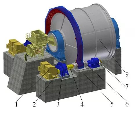 1. 異步電動機 2. 高速聯(lián)軸器 3. 雙輸入行星減速器 4. 齒式聯(lián)軸器 5. 開式齒輪軸組 6. 齒圈 7. 慢速驅(qū)動裝置 8. 磨機本體