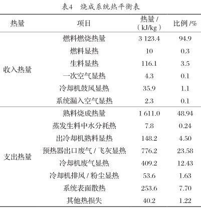 水泥窯系統(tǒng)熱平衡范圍主要包括燒成和冷卻機(jī)系統(tǒng),對(duì)該企業(yè)水泥窯系統(tǒng)的熱平衡進(jìn)行測(cè)試,系統(tǒng)熱量收支平衡如表4所示。
