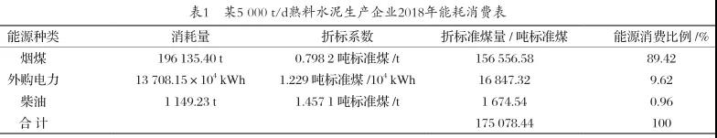 某水泥企業(yè),現(xiàn)有1條5000t/d新型干法水泥回轉(zhuǎn)窯生產(chǎn)線以及2臺(tái)180t/h水泥磨,具有年產(chǎn)普通硅酸鹽水泥熟料150萬t和年產(chǎn)硅酸鹽水泥160萬t的生產(chǎn)能力。主要產(chǎn)品為PO42.5和PS32.5A水泥。主要消耗的能源為煙煤、電力、柴油等。主要生產(chǎn)工序包括石灰石礦山開采、生料制備、熟料煅燒、水泥制成。2018年該企業(yè)綜合能耗為175078.44噸標(biāo)準(zhǔn)煤。主要能源消費(fèi)情況如表1所示。